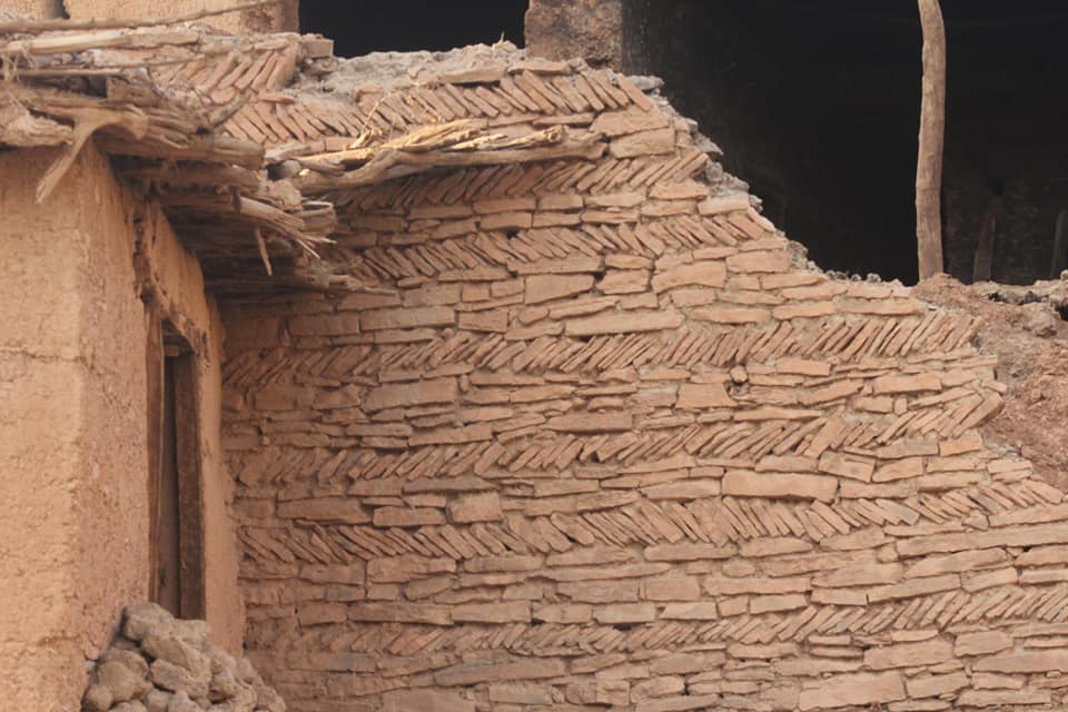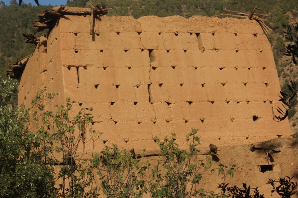 بناية طينية قديمة في تيلوكيت، شُيدت بالمواد الطبيعية المتاحة محليًا (الطين، التبن، الخشب)، وكانت تُستخدم كمسكن عائلي جماعي وكذلك كمخزن للحبوب.